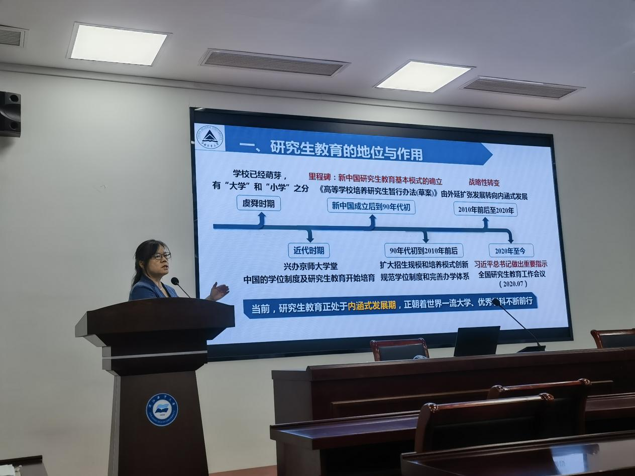 报告会上,李海芬教授就研究生教育的地位与作用、导师角色认知、研究生导师着力提升研究生培养质量策略三个方面进行系统介绍,提出当前研究生教育正处于内涵式发展期,正朝着世界一流大学、优秀学科不断前行。在我国科研兴国战略中,研究生教育是集人才、科技、创新为一体的教育活动,是国家创新驱动战略落实的重要活动。我们要高度重视研究生教育,提升导师队伍水平,培养出高质量的研究生。