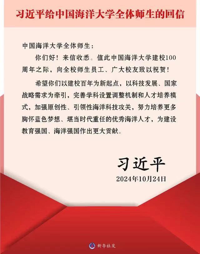 综合办章风云:当习近平总书记将目光投向这条美丽雄宏的蓝色海岸线时,当他提笔祝贺中国海洋大学建校100周年时,我们的胸腔中都跳动着共同的信念,那就是我们都是“海洋人”,我们都是“收信人”,我们都将回应习近平总书记在信中提到的殷殷期望和谆谆嘱托。在信中,习近平总书记提到“努力培养更多胸怀蓝色梦想,堪当时代重任的优秀海洋人才,为建设教育强国、海洋强国作出更大贡献”,这是一封祝福的信,也是习近平总书记向所有海洋高校师生发出的殷切“约定”。作为一名海洋高等教育的老兵,我有幸成为这封“海洋之约”的一名“收信人”,我将在学校回答“海大之问”的征程中,在建设特色鲜明,国内一流海洋大学的战略目标中,在学院聚力海洋新质生产力,实现高质量发展的事业探索中,忠于职守,学思践行,努力奉献一名“海洋人”的力量与智慧。