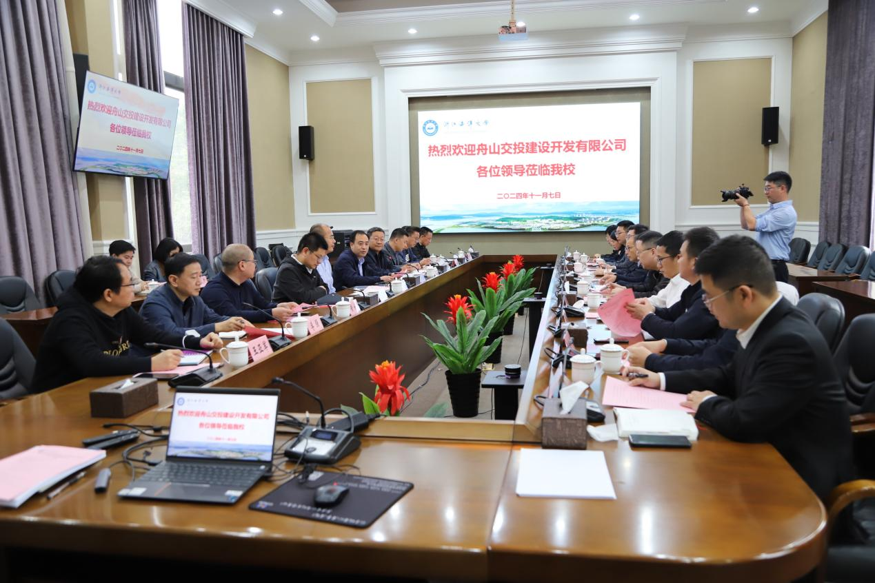 与舟山交投建设开发有限公司校企合作座谈交流暨签约仪式在行政楼6号会议室举行。浙江海洋大学副校长王健鑫到会讲话并见证签约仪式。舟山交投建设开发有限公司董事长虞彭挺、党总支副书记傅必成及相关部门负责人;第一会所