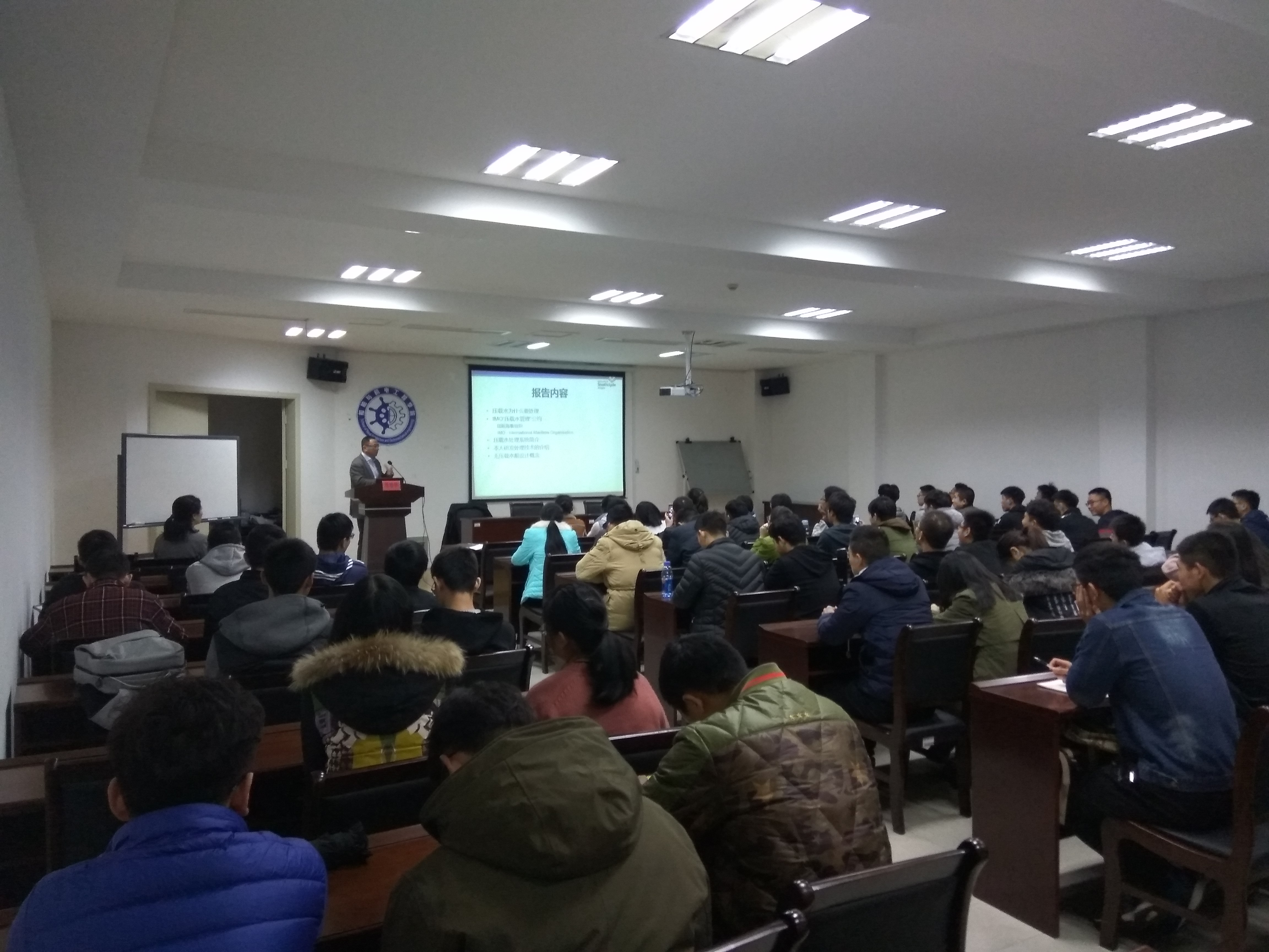 11月30日下午,蓝色大讲堂之船舶压载水处理法规和技术在工科楼119举行。船舶与机电工程学院邀请到英国思克莱德大学周培林教授主讲,讲座由国际交流合作处钟伟良副处长主持。