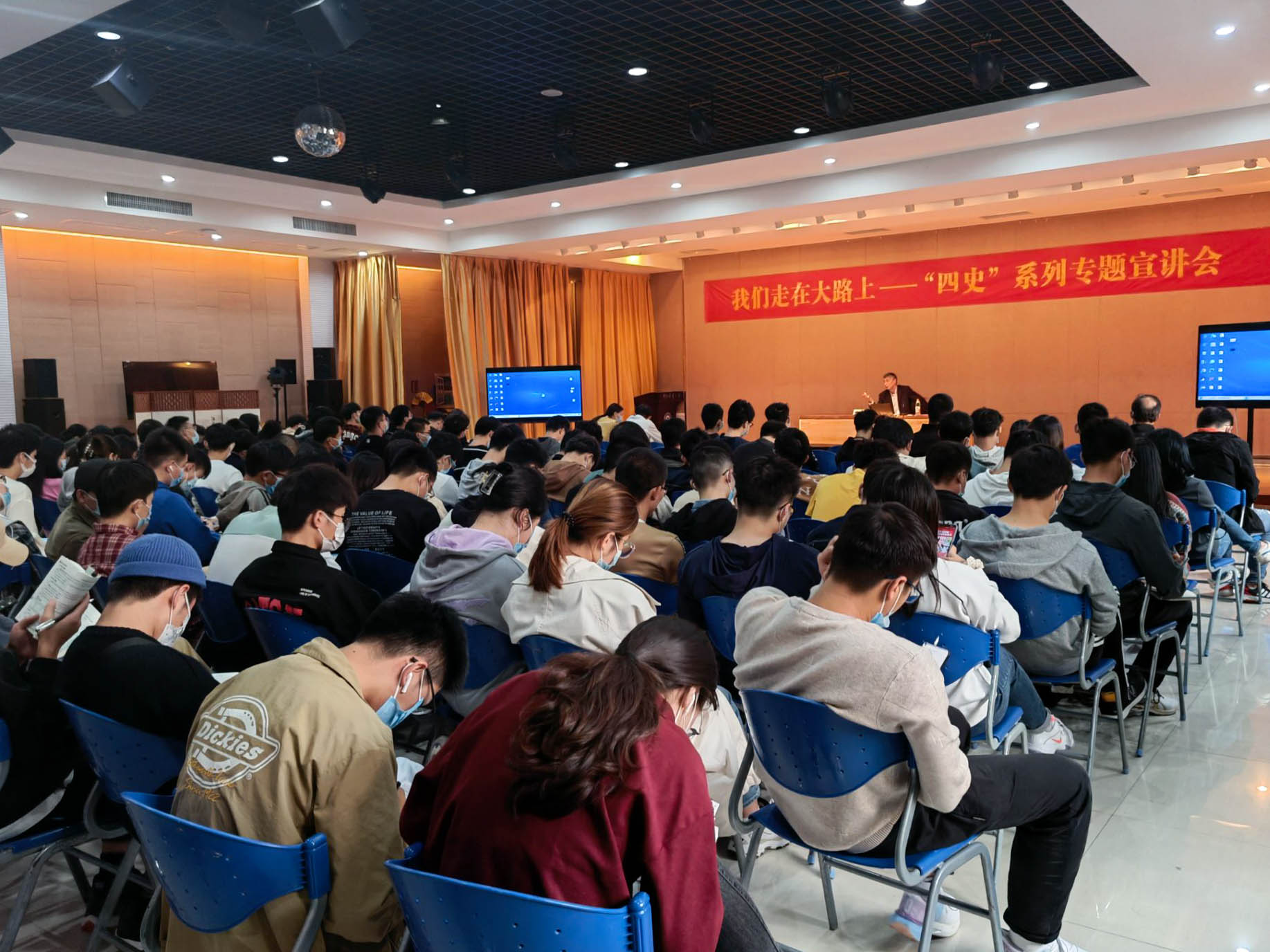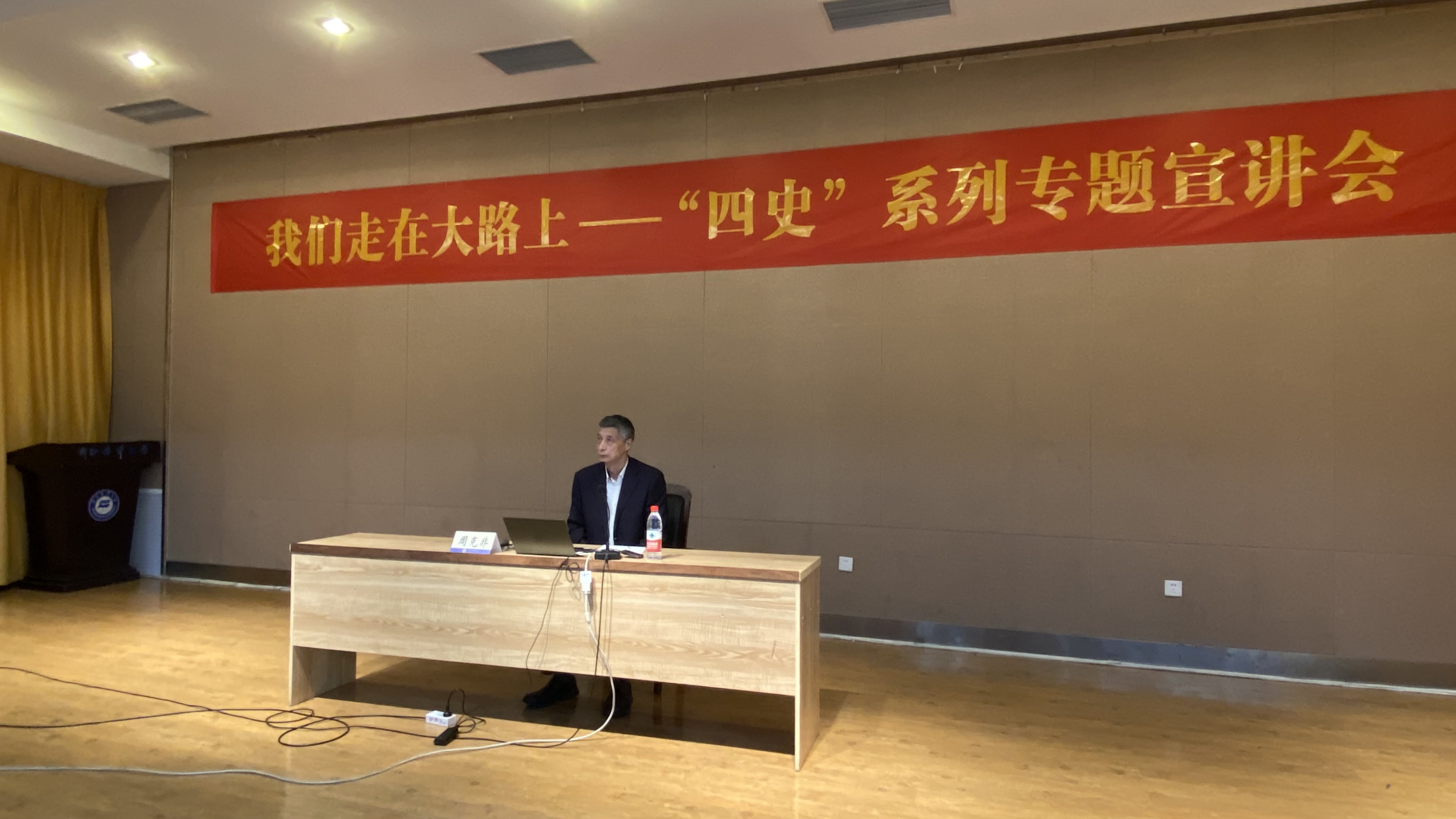 在杨存国活动中心二号厅组织开展了“四史”专题宣讲活动,特别邀请学校原党委书记周克非作专题讲座。讲座由学院党委书记芦茜主持,学院全体师生党员聆听了报告。