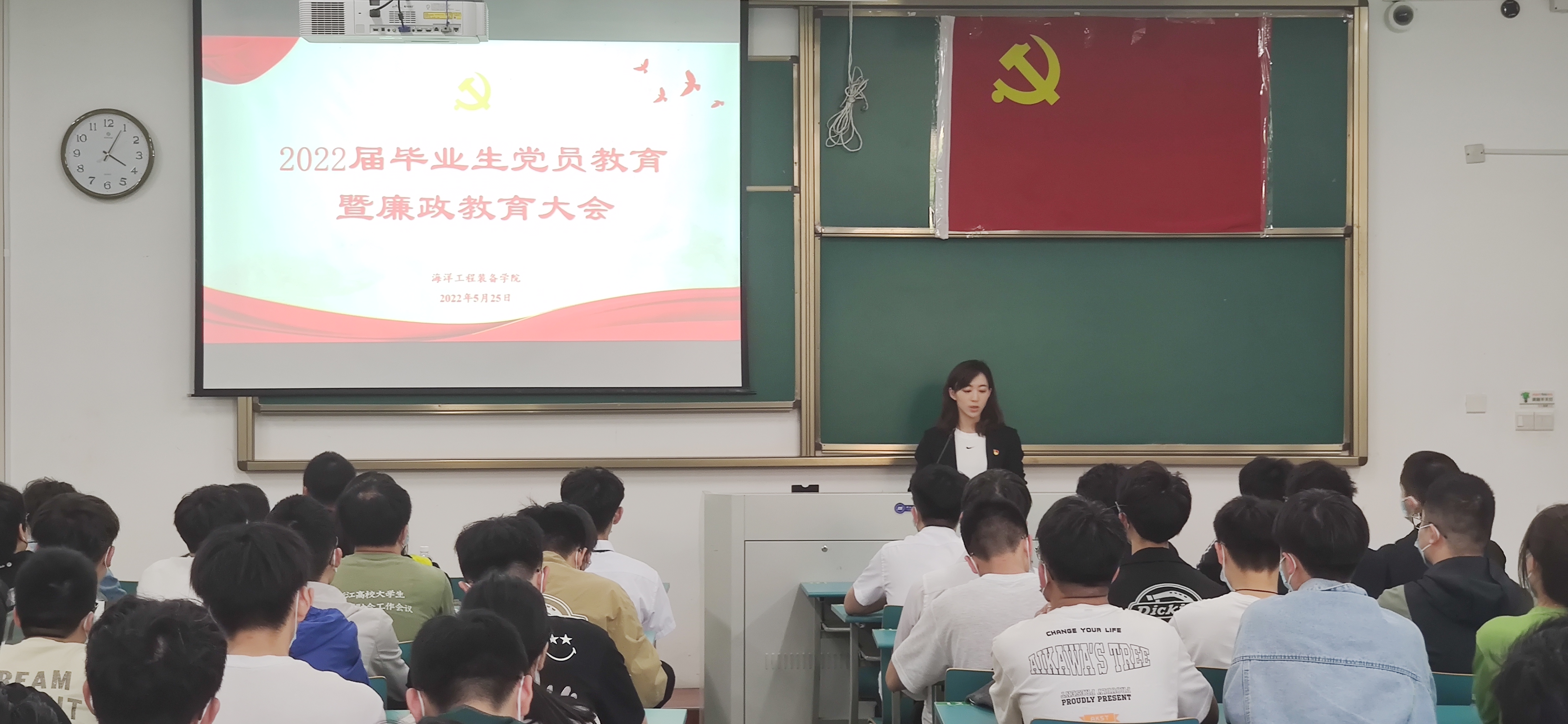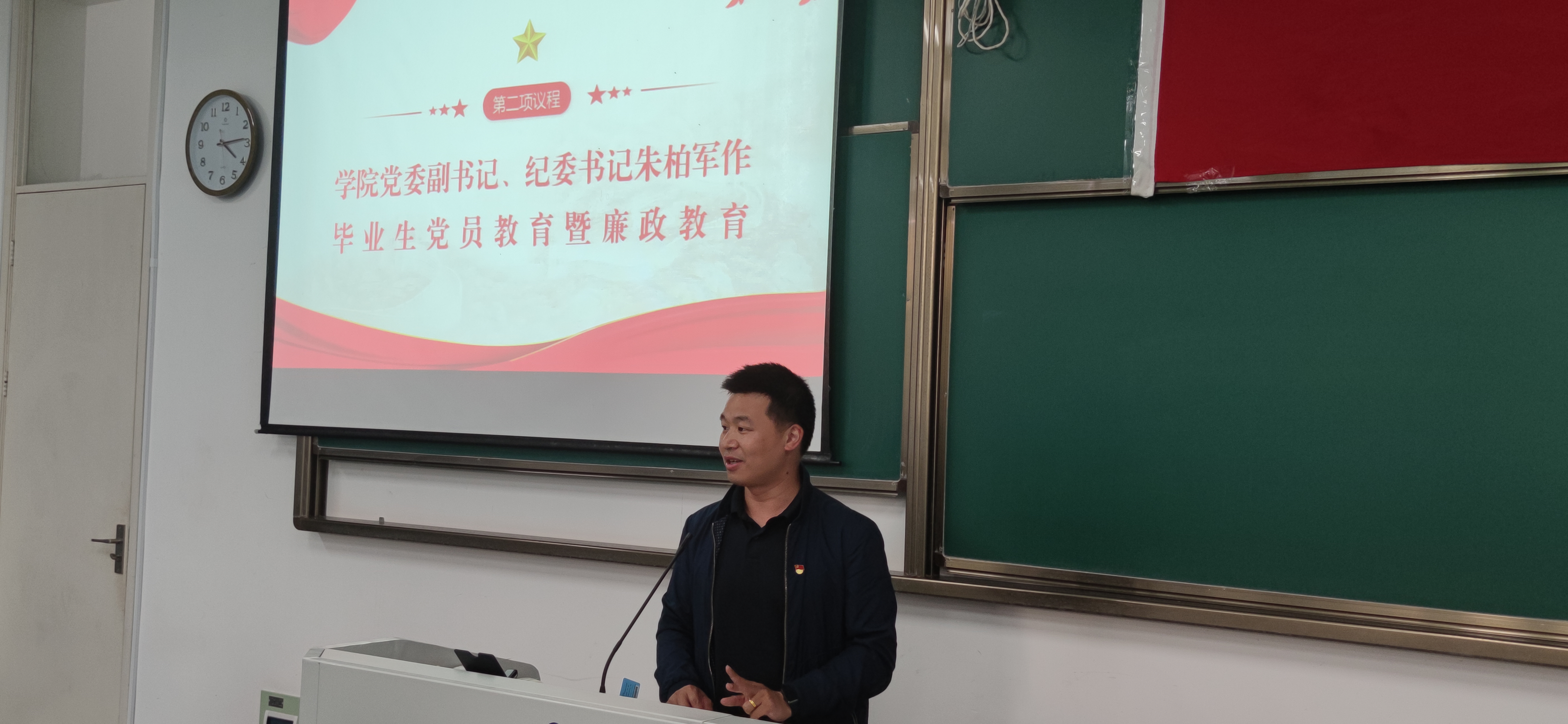 在公共教学楼234教室召开2022届毕业生党员教育暨廉政教育大会。会议由学院学工办主任陈锦阳主持,学院党委副书记、纪委书记朱柏军,各学生党支部书记和全体毕业生党员参加了大会。