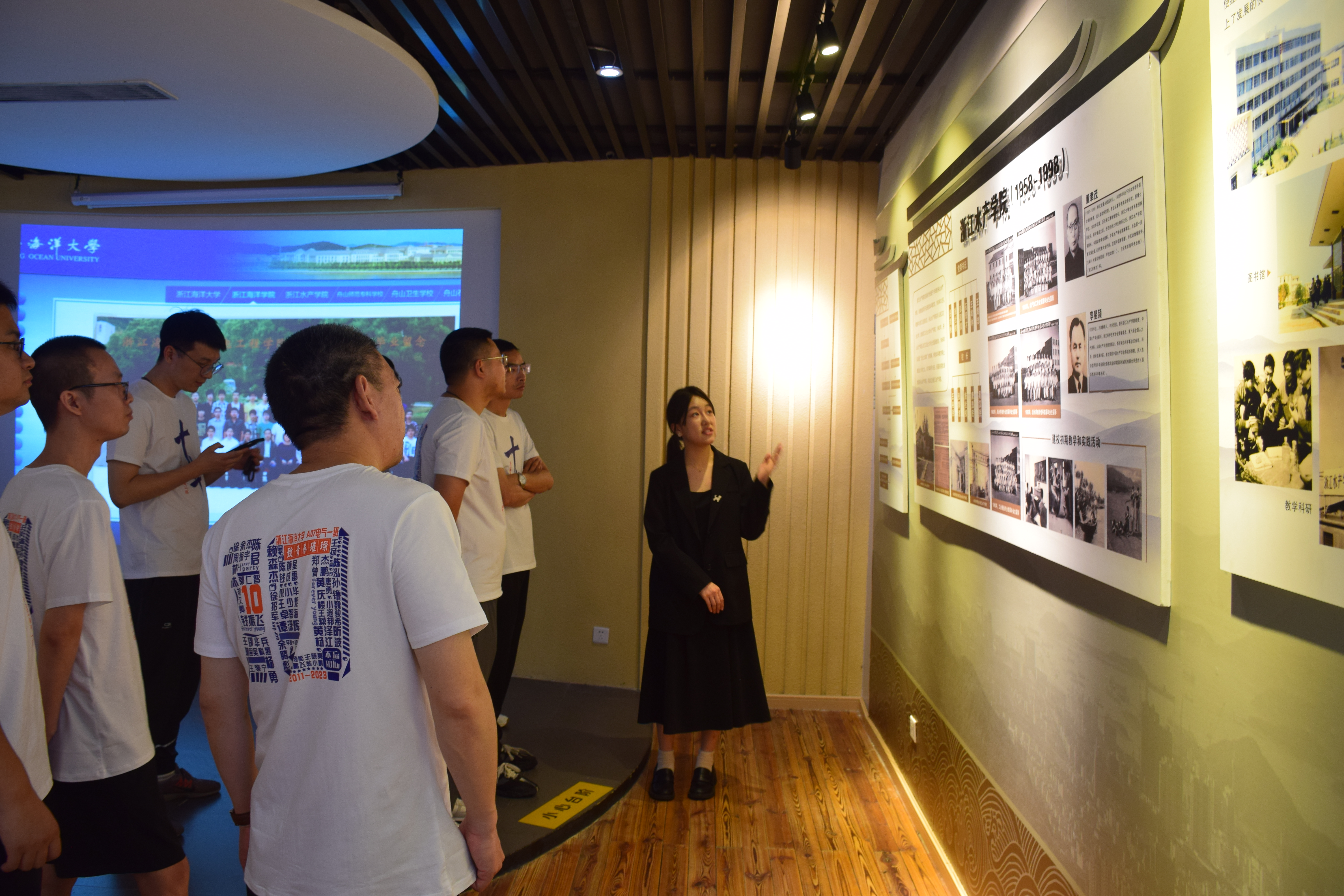 随后,大家来到学校新城校区。同学们先来到图书馆二楼的校史馆,在学妹讲解员的陪同下,聆听了学校65年的发展史,进一步增强了对母校的情感。校史馆参观结束后,同学们游览了新城校区田径场和体育馆,并在揽月湖前合影留念。